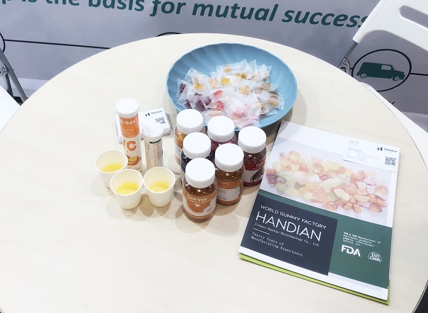 漢典的展品有可愛的小熊軟糖、軟萌的愛心軟糖、晶瑩透光的圓形軟糖、繽紛果味的泡騰片…高顏值展品一下成為吸引專業客戶的法寶。漢典為美西植提展的專業客戶提供了便攜獨立的小樣,了解產品的同時,讓客戶補充一下每日所需營養。