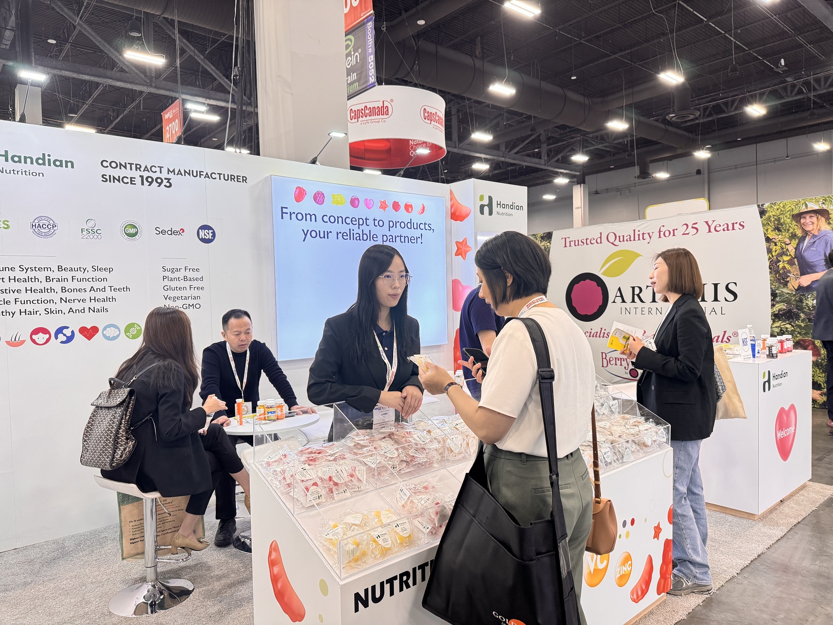 我們的團隊詳細地為新老客戶介紹了我們多樣的營養健康產品、內部生產能力。客戶對漢典不斷創新產品結構的能力給予了極大的肯定,并對我們的一系列新品投以深切的關注。